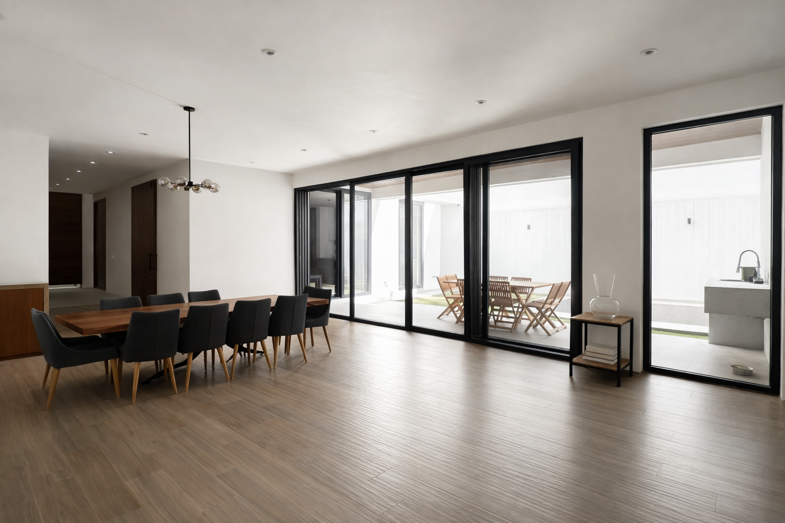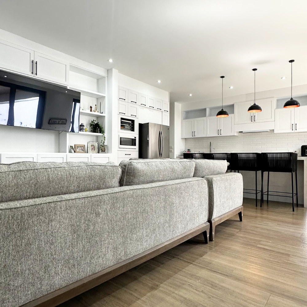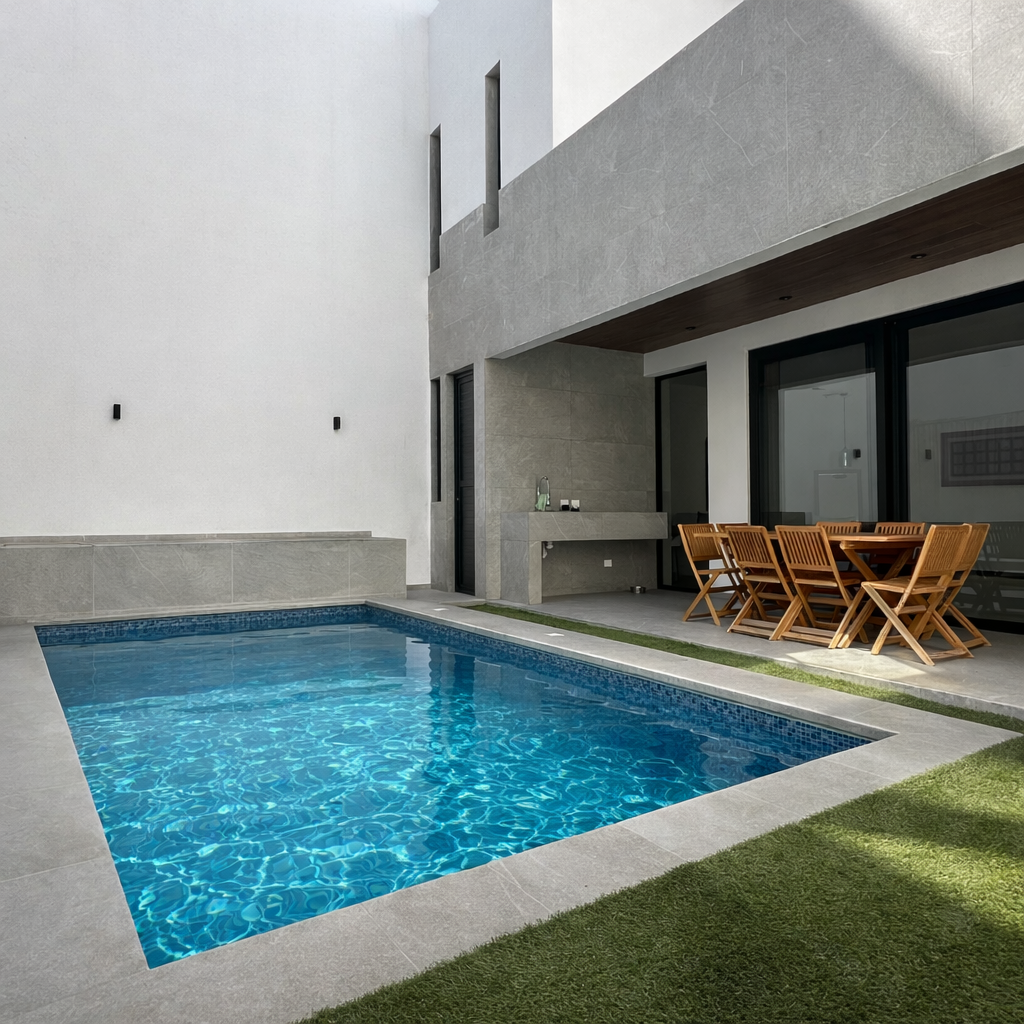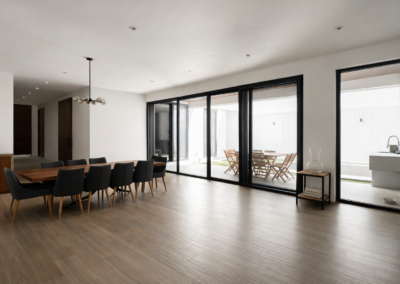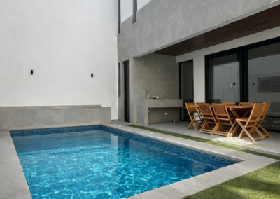 Es una residencia de arquitectura moderna donde cada espacio fue diseñado para convivir, descansar y disfrutar. Su área social integra sala, comedor y cocina con vista directa a la terraza y alberca privada, generando una conexión armónica entre interior y exterior.